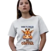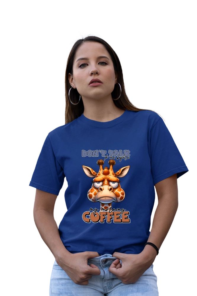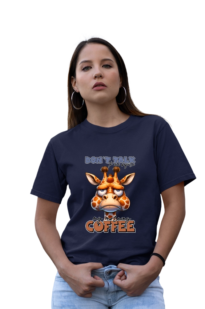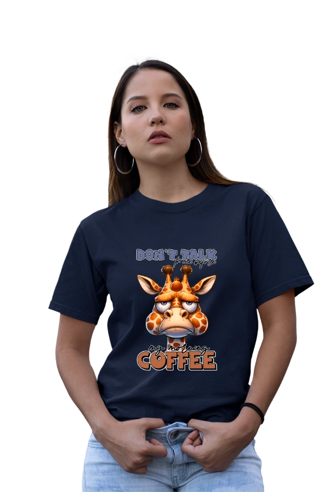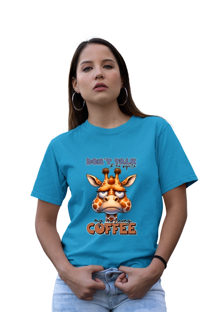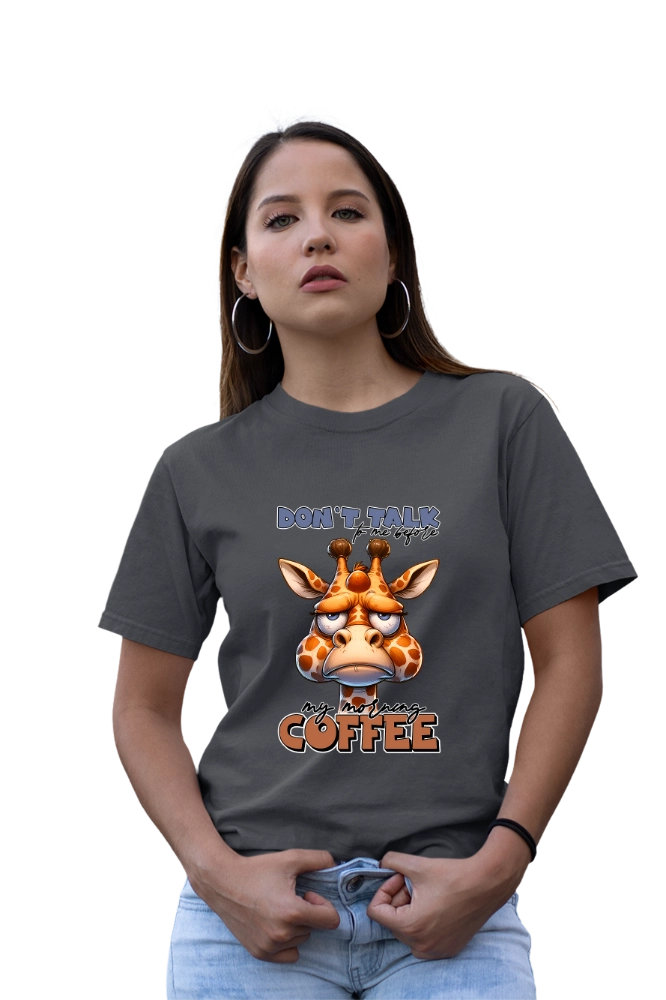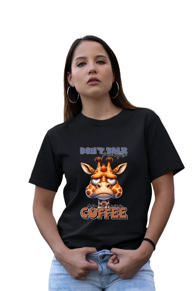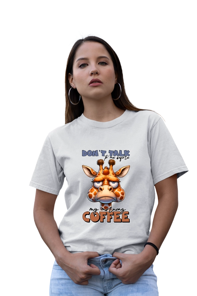 Το funny coffee t-shirt εκφράζει με χιούμορ τη γνωστή ανάγκη για καφέ πριν ξεκινήσει η μέρα. Επιπλέον, το “Don’t Talk To Me Before Coffee” μήνυμα σε συνδυασμό με το χαριτωμένο giraffe design δημιουργεί ευχάριστη και relatable εικόνα. Έτσι, το αποτέλεσμα παραμένει ανάλαφρο αλλά και δυναμικό. Η εφαρμογή είναι άνετη και σταθερή για καθημερινή χρήση. Παράλληλα, το ύφασμα παραμένει απαλό και ελαφρύ. Ακόμη, επιτρέπει ελευθερία κινήσεων σε κάθε δραστηριότητα.